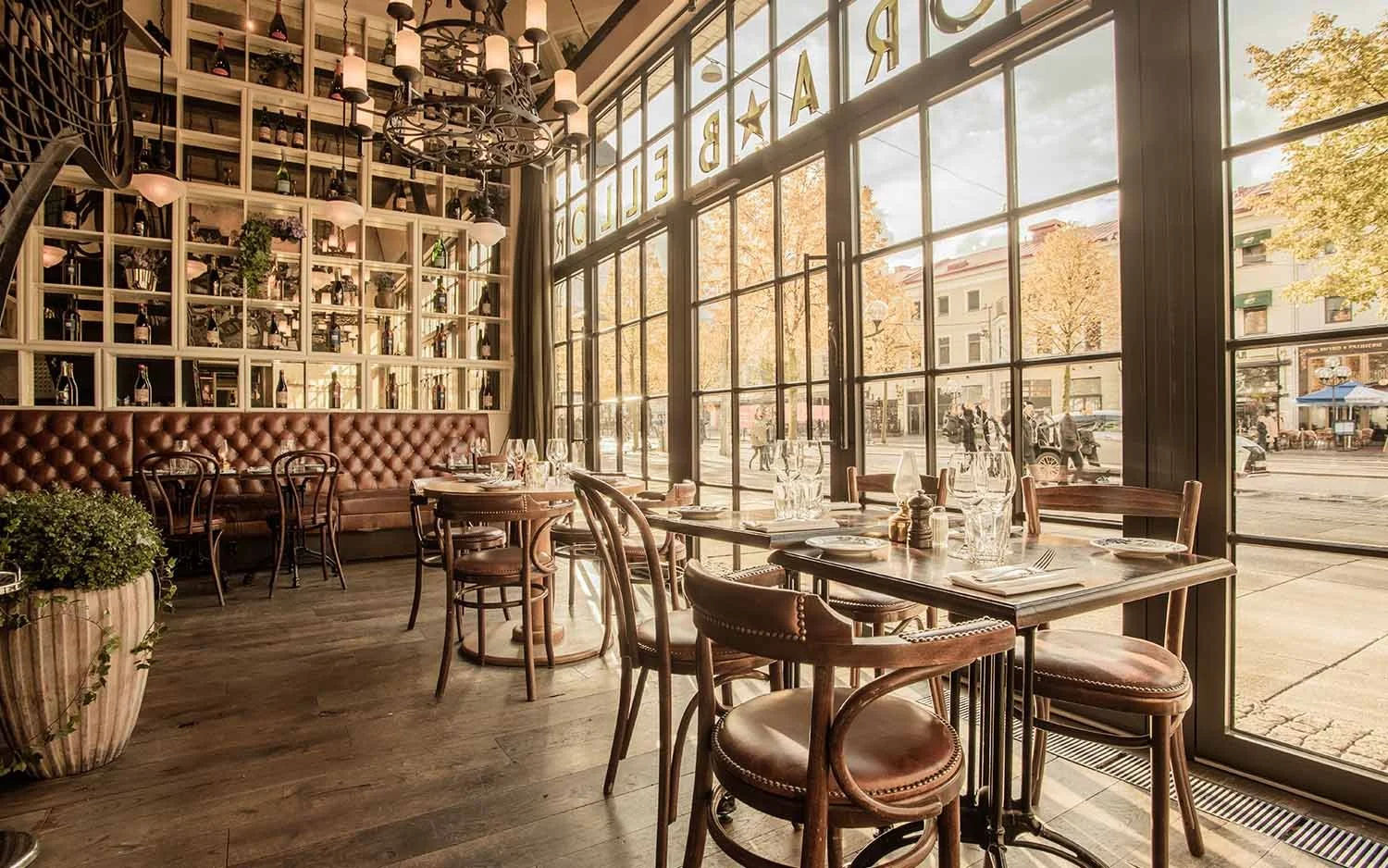 Inredningen är klassiskt Ess: rustikt men elegant. Varmt läder, ljusa väggar och en eklektisk samling trästolar.