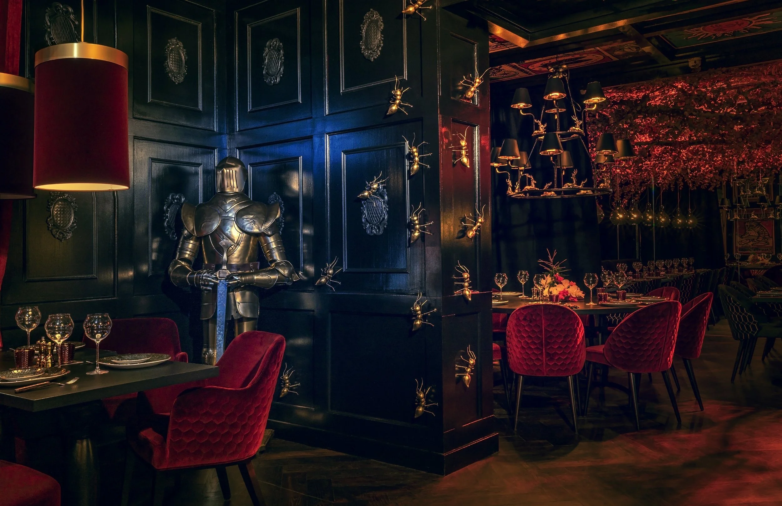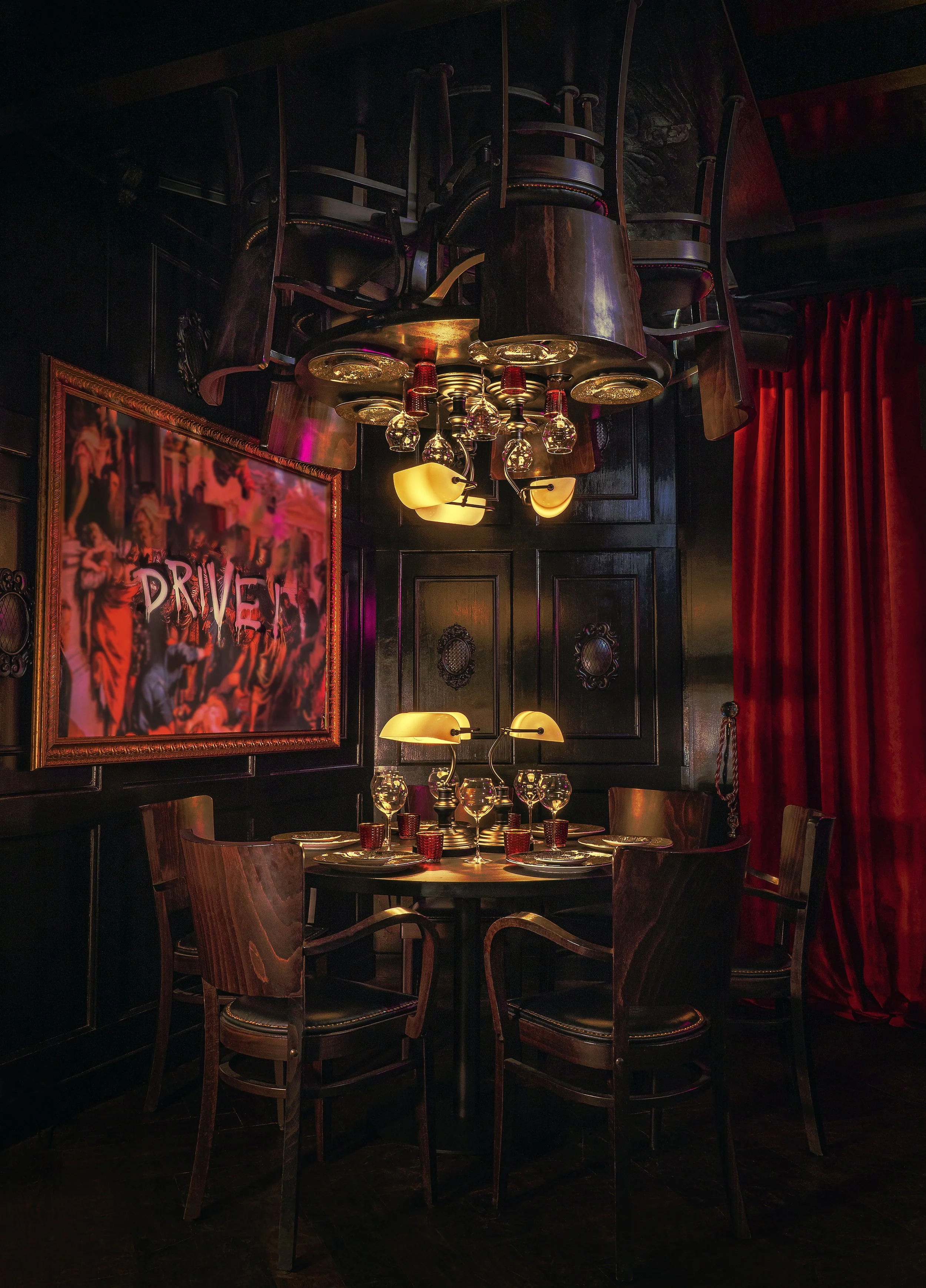 Växjö Umami Grill är flera koncept i ett. En grillrestaurang där lyx möter kaos, en sinnessjuk aristokrats matsalong. I en del hänger ett dukat bord i taket. En del är en vadderad isoleringscell. En del har brunnit ner. I en del bildar runt tusen bollar i olika storlekar en åskmolnhimmel.
